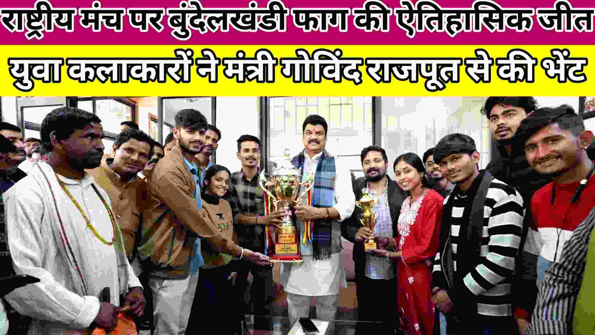भारत सरकार खेल मंत्रालय द्वारा आयोजित देश के सबसे प्रतिष्ठित मंचों में से एक राष्ट्रीय युवा उत्सव विकसित भारत-2047 यंग इंडिया लीडर डायलाॅग में बुंदेलखंड के युवाओं ने समूचे देश में बुंदेलखंड के प्रसिद्ध गायन “फाग” की प्रस्तुतिकरण कर 29 वर्ष में पहली बार प्रथम स्थान दिलाने वाली टीम ने सोमवार को खाद्य नागरिक आपूर्ति एवं उपभोक्ता संरक्षण मंत्री गोविंद राजपूत के निज निवास पहुंचकर उनसे भेंट की एवं आर्शीवाद प्राप्त किया।