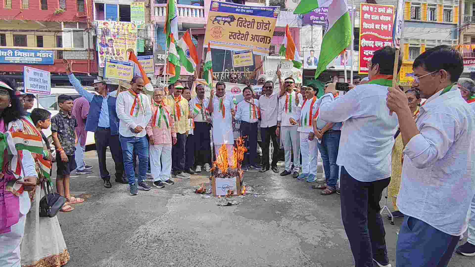 स्वतंत्रता दिवस की पूर्व संध्या पर स्वदेशी जागरण मंच के स्वदेशी सुरक्षा ए‌वं स्वावलंबी अभियान के अंतर्गत लायंस क्लब, कैट एवं अन्य संगठनों ने नमक मंडी स्थित कीर्ति स्तभ चौक पर विदेशी कंपनियां भारत छोड़ो का शंखनाद किया एवं तीनबत्ती पर विदेशी सामान की होली जलाई गई ।