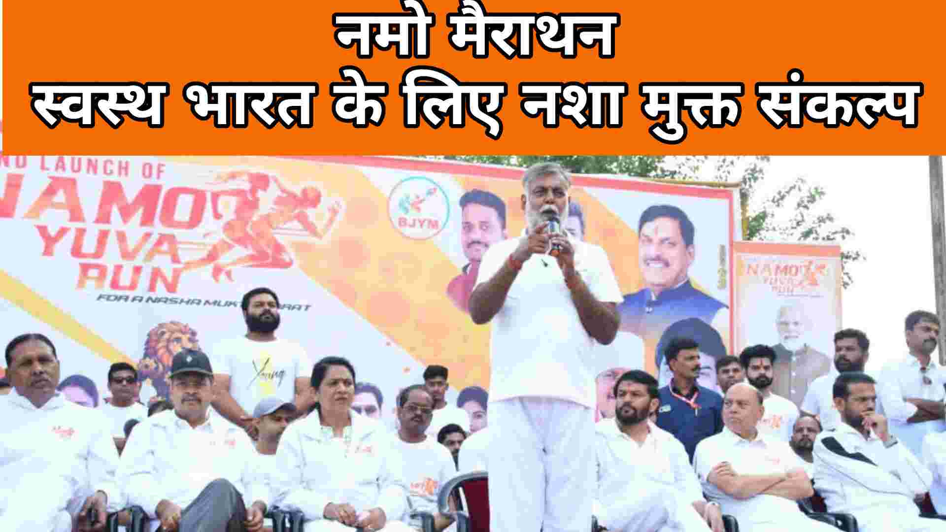 भारत सरकार एवं मध्य प्रदेश सरकार के आह्वान पर आयोजित सेवा पखवाड़ा के तहत नमो मैराथन दौड़ कार्यक्रम में पंचायत ग्रामीण एवं विकास मंत्री प्रहलाद पटेल ने कहा कि यह मैराथन केवल दौड़ नहीं बल्कि आने वाली पीढ़ी के लिए एक स्वस्थ रहने का संकल्प है। उन्होंने कहा कि मैराथन एक लंबी दौड़ नहीं जिसमें 100 मी से 1000 मीटर तक आदमी दौड़ता है यह दौड़ नशे के विरुद्ध है और आज हमें सभी को संकल्प लेना है कि हम कभी भी नशा नहीं करेंगे और अपने साथ वालों से भी नशा न करने के लिए प्रेरित करेंगे। उन्होंने कहा कि हमारा भारत देश नंबर वन पर तब पहुंचेगा जब हम नशे के लिए तिलांजलि देंगे।